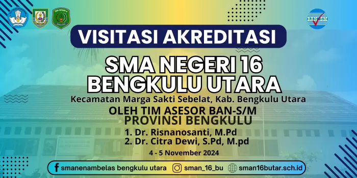 Pada tanggal 04-05 November 2024, SMA Negeri 16 Bengkulu Utara telah melaksanakan kegiatan akreditasi yang merupakan proses penting untuk penilaian mutu pendidikan di sekolah kami. Proses akreditasi ini melibatkan evaluasi terhadap empat instrumen utama yaitu kinerja tenaga pendidik, kinerja kepala sekolah, dan kondisi lingkungan sekolah.